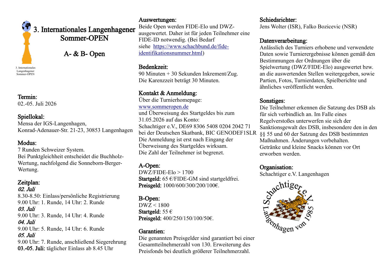 Die Schachtiger e.V. Langenhagen freuen sich, vom 2.-5. Juli 2026 zahlreiche Teilnehmer aus aller Welt bei sich begrüßen zu dürfen!